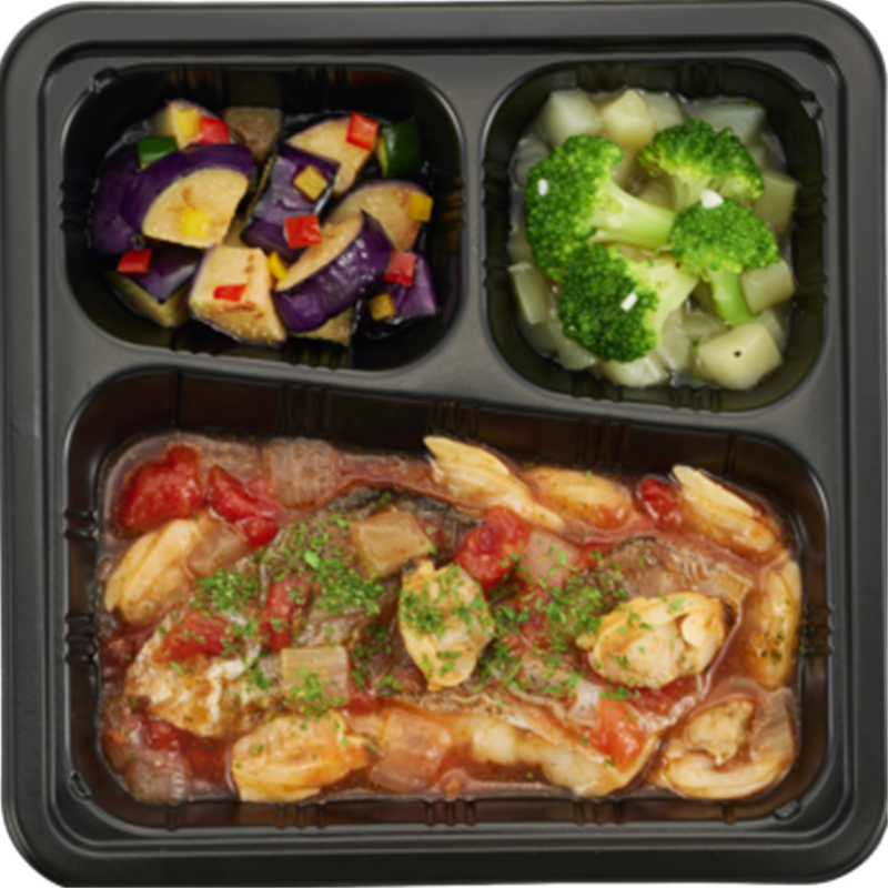 ポテトとブロッコリーのアンチョビソテー - 【材料】 タラ(ロシア産)、トマト・ピューレー漬、ゆであさり、じゃがいも、素揚げなす、ブロッコリー、白ワイン、玉ねぎ、加熱済野菜ミックス(ズッキーニ、なす、赤パプリカ、黄パプリカ、その他)、難消化性デキストリン、なたね油、食塩、オリーブオイル、砂糖、はちみつ、にんにく、ぶどう酢、ホタテエキスパウダー、アンチョビーソース、麦芽糖調製品、おろしにんにく、エキス調味料、パセリ粉、白こしょう、黒こしょう/増粘剤(加工デンプン、増粘多糖類)、調味料(アミノ酸等)、酸化防止剤(亜硫酸塩)